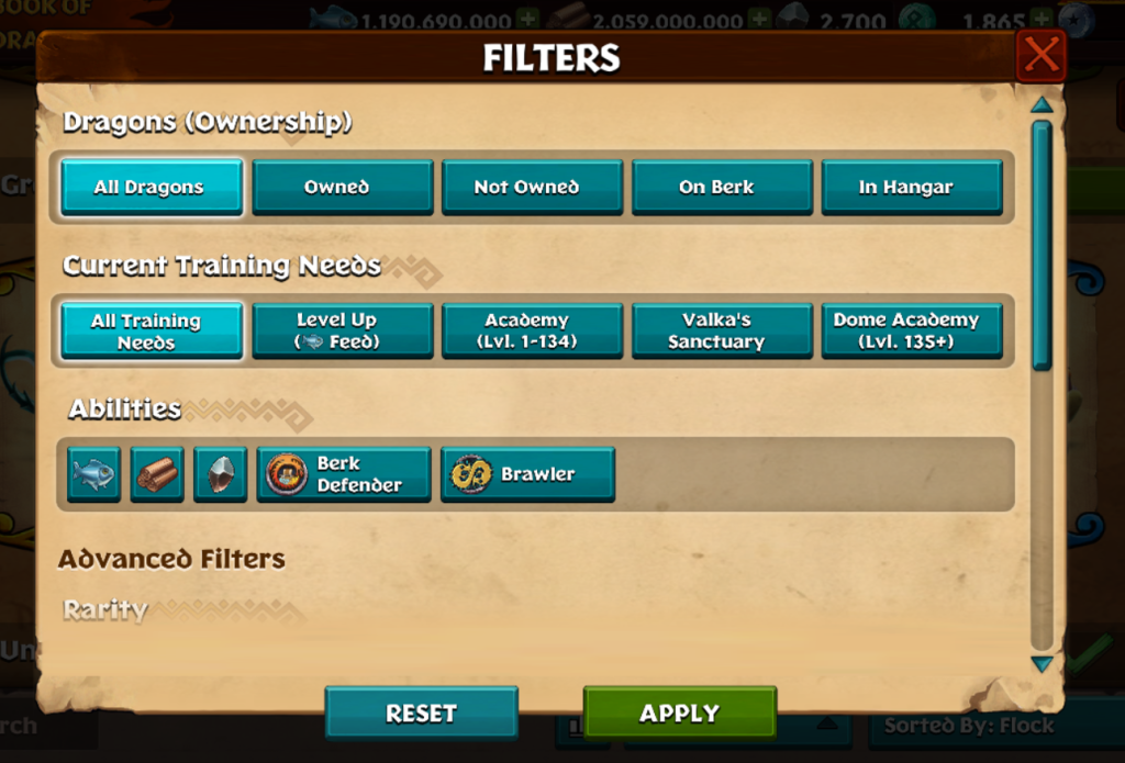 Easily filter your dragons by those you own, those currently on Berk, or those resting in the Hangar.