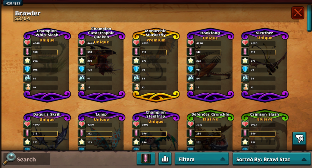 Sort your dragons by detailed Brawl and Defend Berk stats to quickly find your strongest brawlers and defenders.